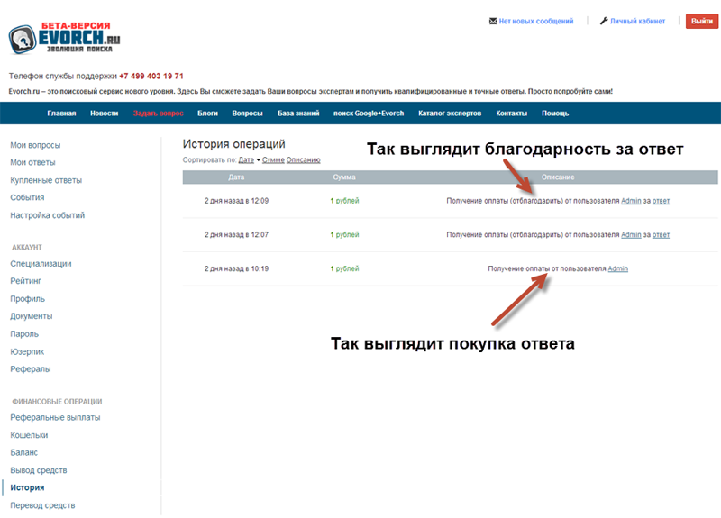 Добавлена возможность просматривать историю платежей за ответы. Какую сумму , какого числа, за какой ответ получил эксперт.
