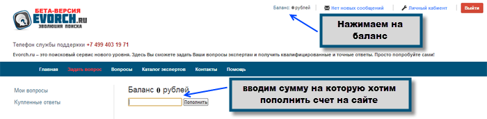 Для этого Вам надо авторизоваться на сайте, т.е. ввести свой логин и пароль, затем кликнув на надпись Баланс,