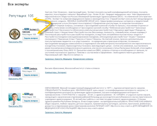 Репутация – это оценка компетентности эксперта в выбранной специализации, причем эту оценку ему дают PRO эксперты этой же специализации.